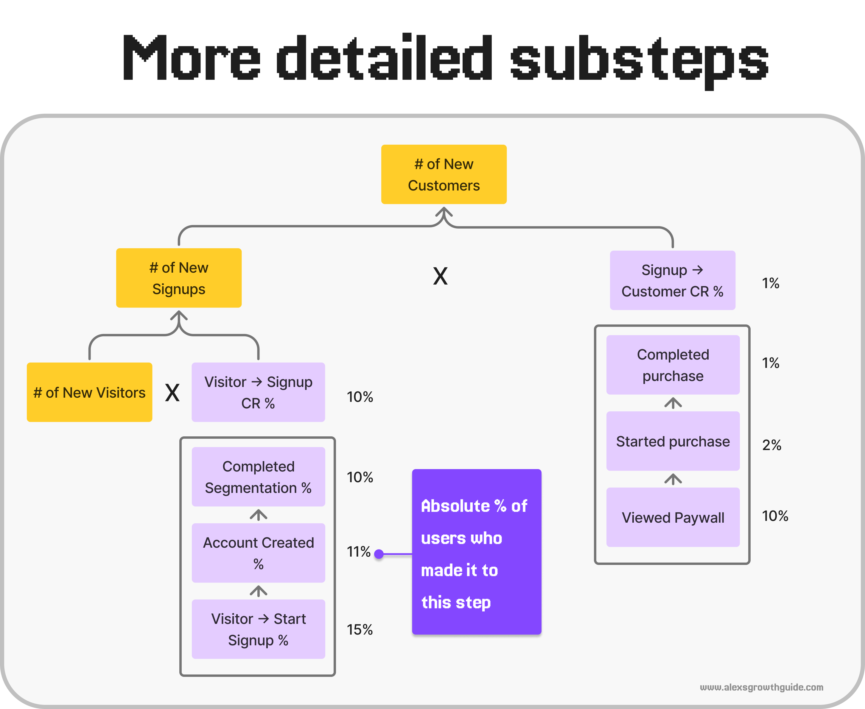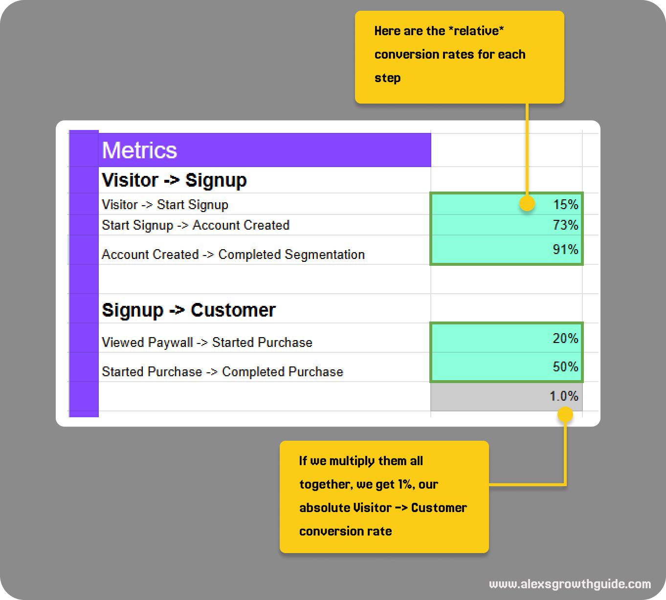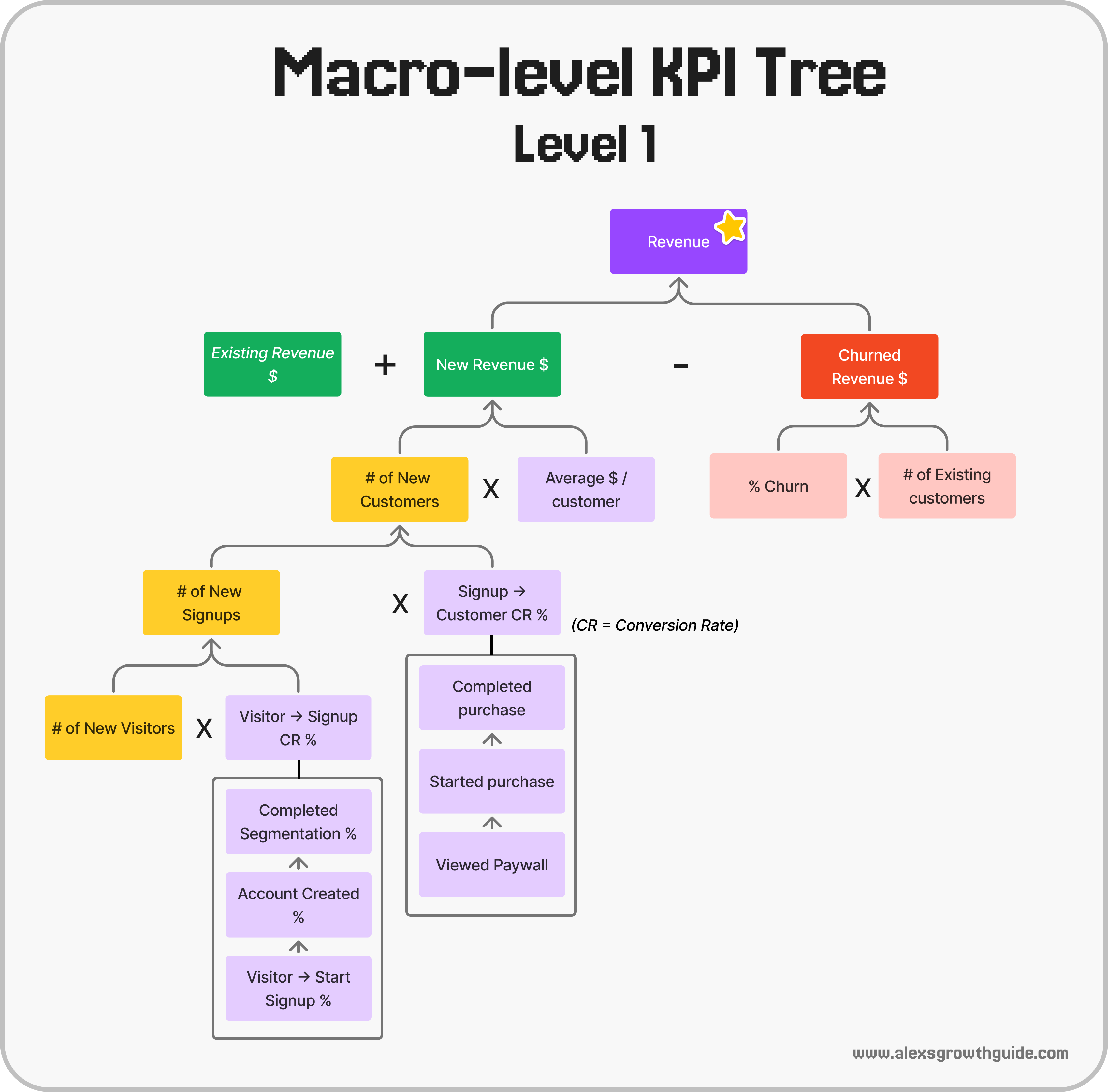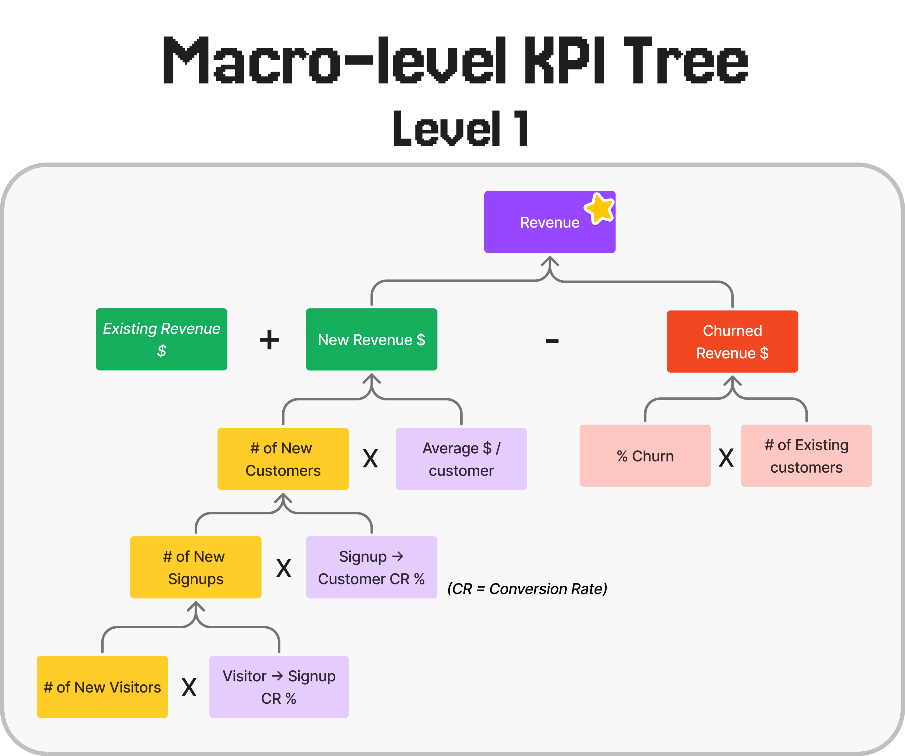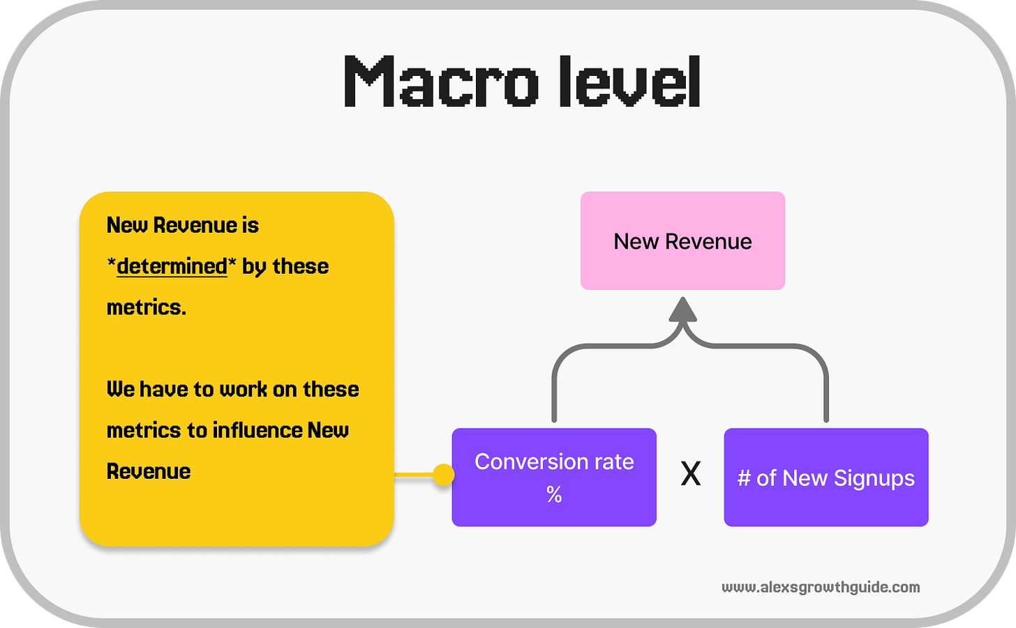 New Signups = Unique Visitors * Visitor → Signup Conversion Rate %