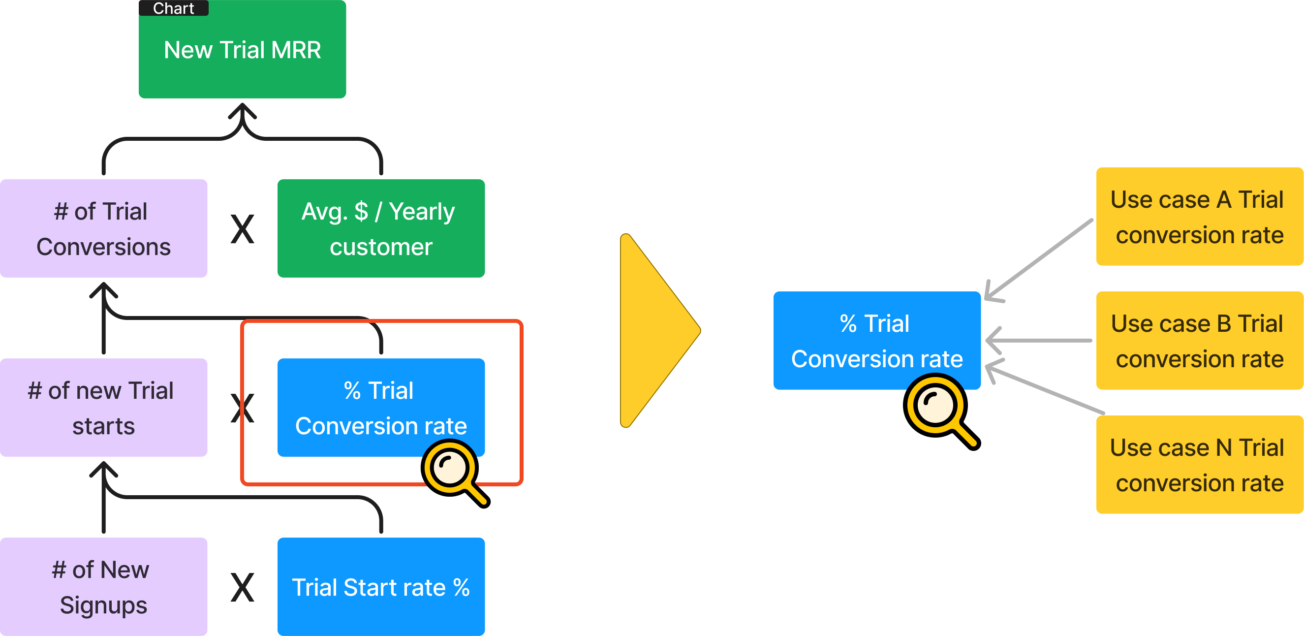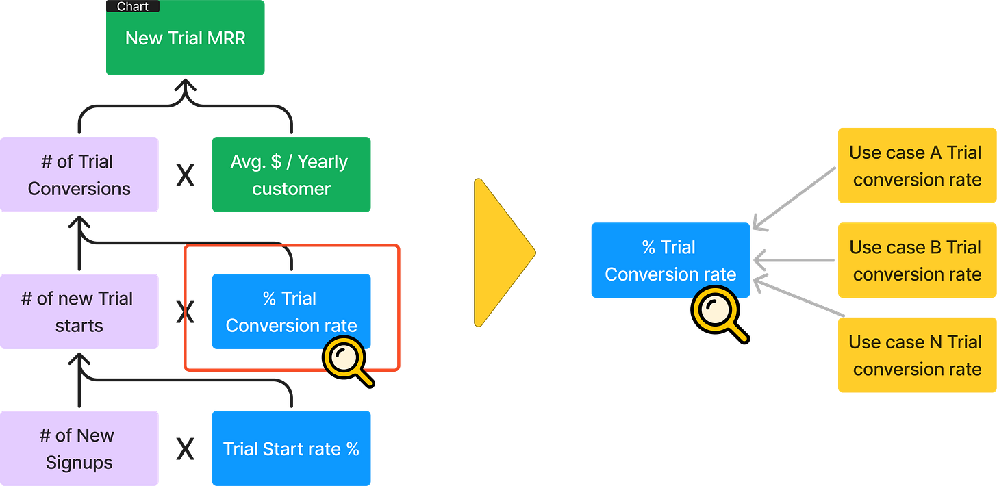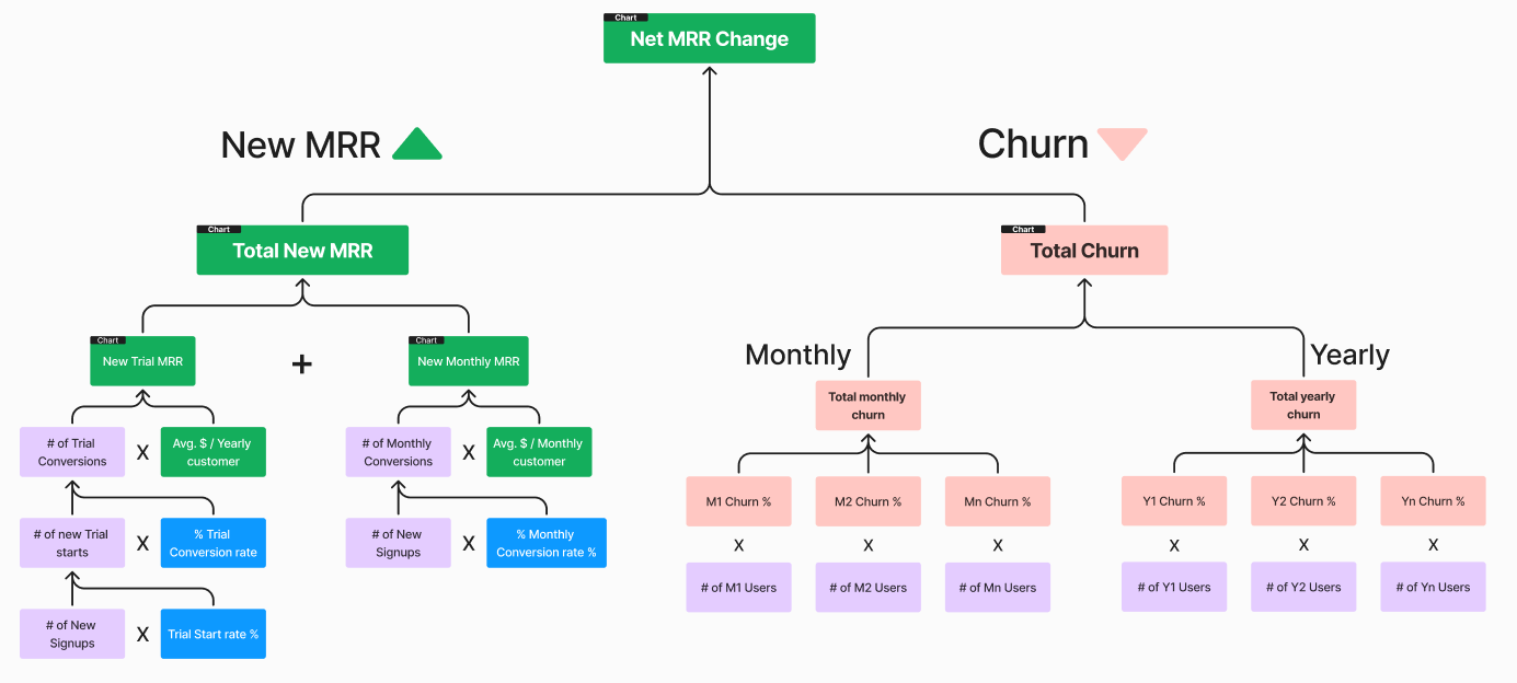 Here’s a visual representation of the “Macro” part of a KPI Tree for a SaaS product with monthly & trial subscriptions: